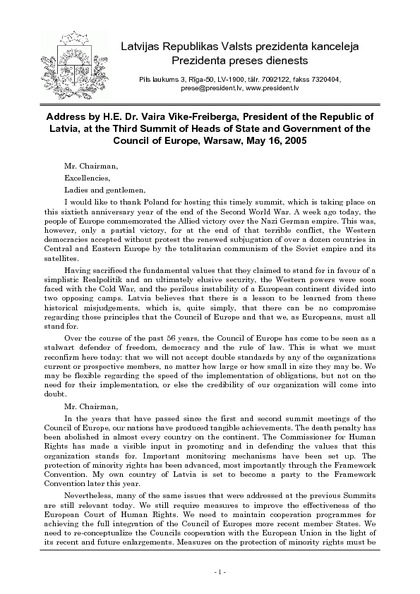 Address by H.E. Dr. Vaira Vike-Freiberga, President of the Republic of Latvia, at the Third Summit of Heads of State and Government of the Council of Europe, Warsaw, May 16, 2005