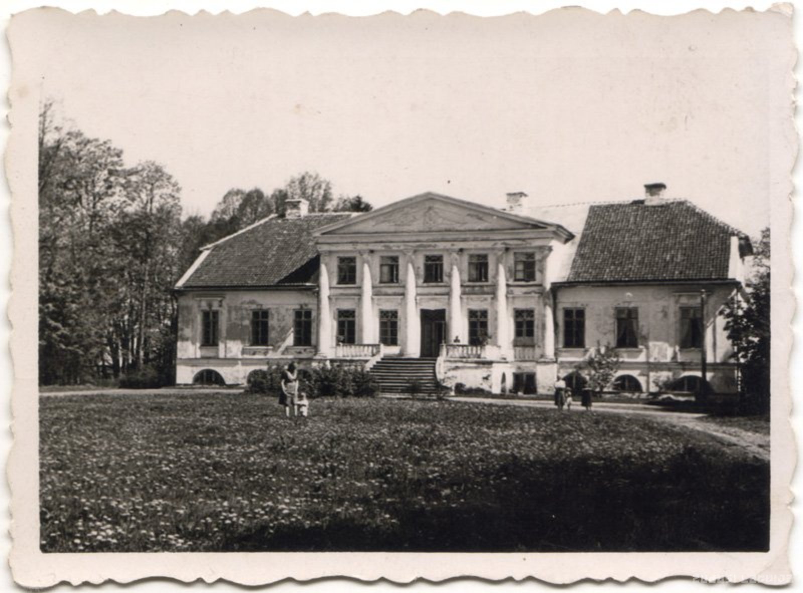 Dinsdurbes muižas kungu māja celta 19. gadsimta 30. gados klasicisma stilā pēc netālu esošās Elejas pils parauga. Attēlā redzama galvenā fasāde ar seškolonnu portiku, virs kura frontonā redzams muižas īpašnieku Bage af Bo dzimtas ģerbonis, un to papildinoša lapu vītne, kas šeit parādījās jau pēc 1900. gada. Ap Dinsdurbes muižas ēku atradās parks ar svešzemju kokiem un krūmiem, kas izveidots ap 1890. gadu. Sakarā ar agrāro reformu muižas ēkas un teritorija nonāca valsts īpašumā, bet tā kā šeit netika ierīkota ne skola, ne kāda cita saimnieciska iestāde, muižas ēkas ilgi palika novārtā. Attēls uzņemts laika periodā no Pirmā pasaules kara beigām līdz 1934. gadam, kad muižas kungu mājā tika veikti vien zināmi uzturēšanas darbi. Pēc tam, kad 1934. gadā tā kļuva par pēdējā nomnieka Ģedimina Sandera īpašumu, tika atjaunotas gan ēkas fasādes, gan iekštelpas un sakopts parks. Dinsdurbes muiža līdz mūsdienām nav saglabājusies - tā daļēji tika nopostīta Otrā pasaules kara laikā, taču, tā kā pēc tam vairs nav mēģināts to atjaunot, tā ir zudusi pilnībā. Muižas parks mūsdienās ir ieguvis vietējās nozīmes aizsargājamas dabas teritorijas statusu