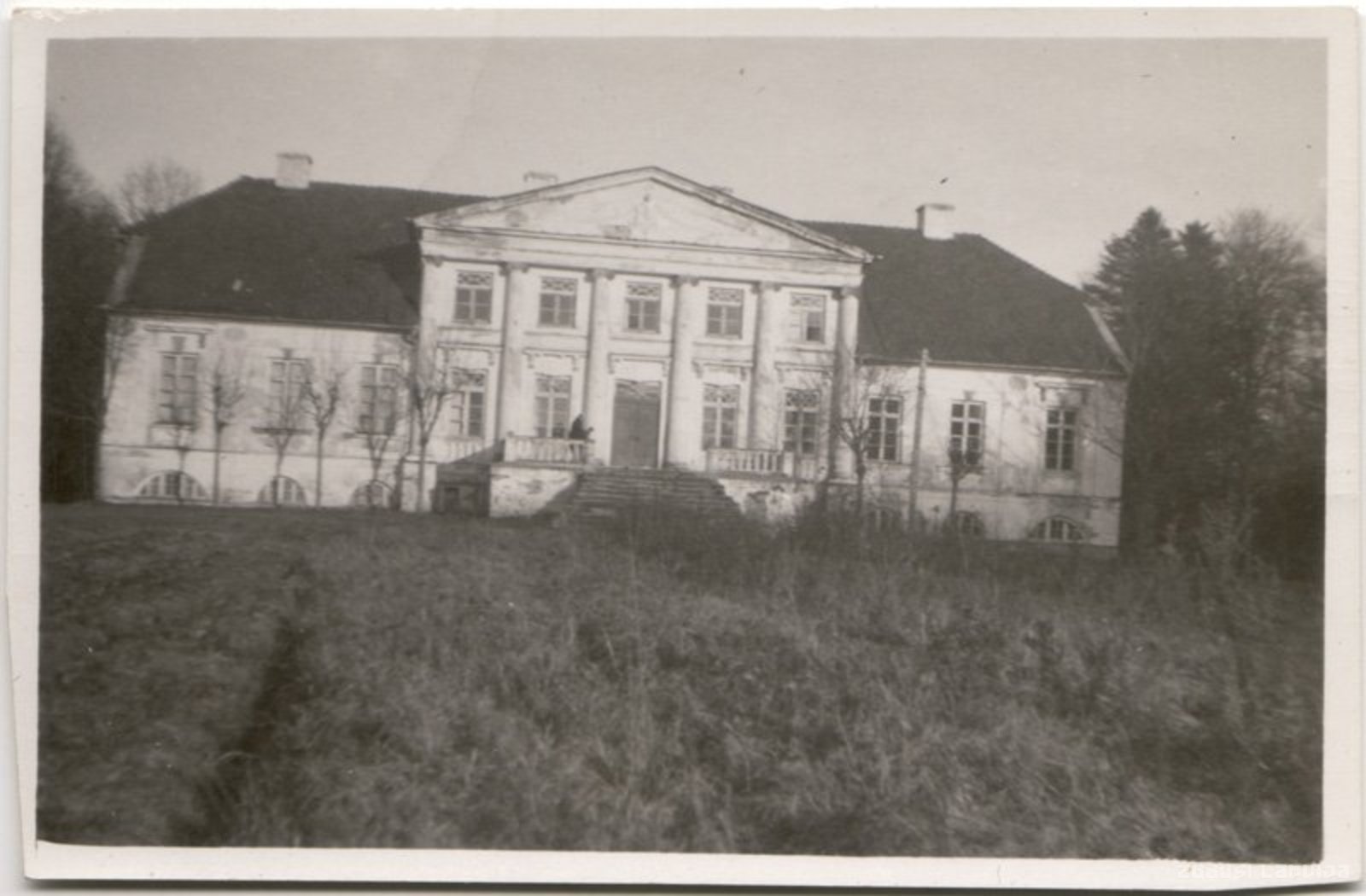 Dinsdurbes muižas kungu māja celta 19. gadsimta 30. gados klasicisma stilā pēc netālu esošās Elejas pils parauga. Attēlā redzama galvenā fasāde ar seškolonnu portiku, virs kura frontonā atradās muižas īpašnieku Bage af Bo dzimtas ģerbonis, un pēc 1900. gada to papildinoša lapu vītne. Ap Dinsdurbes muižas ēku atradās parks ar svešzemju kokiem un krūmiem, kas izveidots ap 1890. gadu. Sakarā ar agrāro reformu muižas ēkas un teritorija nonāca valsts īpašumā, bet tā kā šeit netika ierīkota ne skola, ne kāda cita saimnieciska iestāde, muižas ēkas ilgi palika novārtā. Līdz 1934. gadam muižas kungu mājā tika veikti vien zināmi uzturēšanas darbi. Attēls uzņemts pēc tam, kad 1934. gadā tā kļuva par pēdējā nomnieka Ģedimina Sandera īpašumu - tad tika atjaunotas gan ēkas fasādes, gan iekštelpas un sakopts parks. Dinsdurbes muiža līdz mūsdienām nav saglabājusies - tā daļēji tika nopostīta II pasaules kara laikā, taču, tā kā pēc tam vairs nav mēģināts to atjaunot, tā ir zudusi pilnībā. Muižas parks mūsdienās ir ieguvis vietējās nozīmes aizsargājamas dabas teritorijas statusu