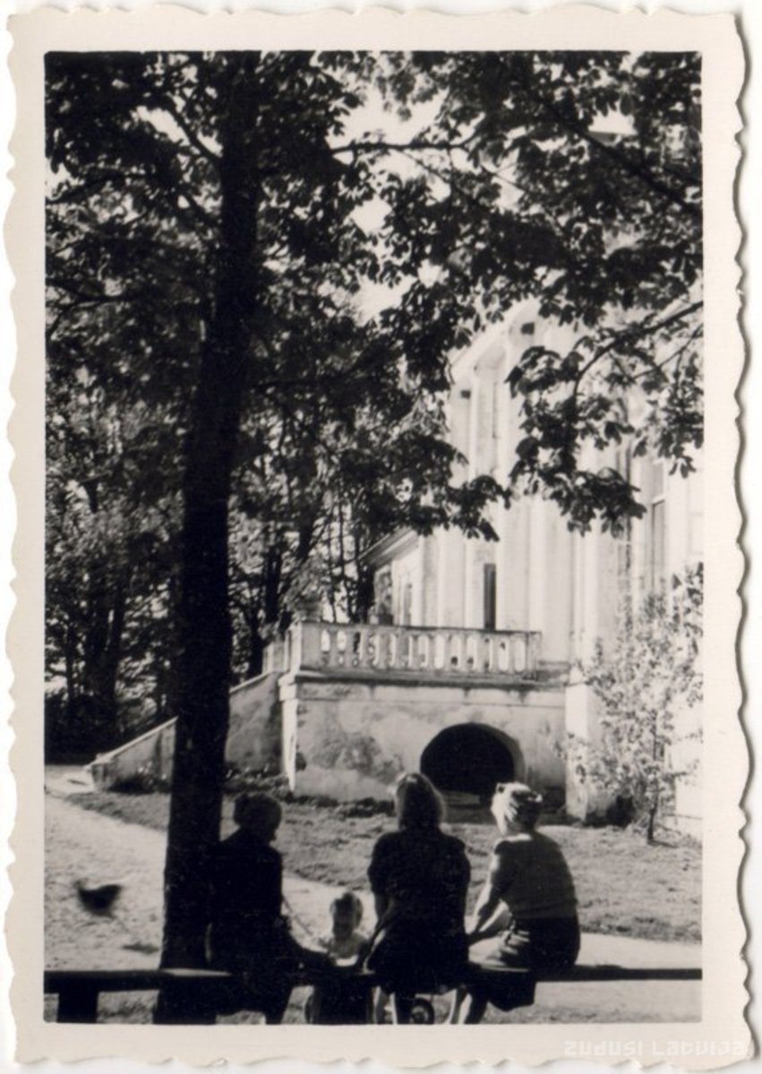 Nezināmi cilvēki pie Dinsdurbes muižas kungu mājas 20. gs. 40. gados. Dinsdurbes muižas kungu māja celta 19. gs. 30. gados klasicisma stilā pēc netālu esošās Elejas pils parauga. Attēlā redzams galvenās fasādes fragments un kāpnes. Ap Dinsdurbes muižas ēku atradās parks ar svešzemju kokiem un krūmiem, kas izveidots ap 1890. gadu. Sakarā ar agrāro reformu muižas ēkas un teritorija nonāca valsts īpašumā, bet tā kā šeit netika ierīkota ne skola, ne kāda cita saimnieciska iestāde, muižas ēkas ilgi palika novārtā. Līdz 1934. gadam muižas kungu mājā tika veikti vien zināmi uzturēšanas darbi. Pēc 1934. gada tā kļuva par pēdējā nomnieka Ģedimina Sandera īpašumu - tad tika atjaunotas gan ēkas fasādes, gan iekštelpas un sakopts parks. Dinsdurbes muiža līdz mūsdienām nav saglabājusies - tā daļēji tika nopostīta II pasaules kara laikā, taču, tā kā pēc tam vairs nav mēģināts to atjaunot, tā ir zudusi pilnībā. Muižas parks mūsdienās ir ieguvis vietējās nozīmes aizsargājamas dabas teritorijas statusu