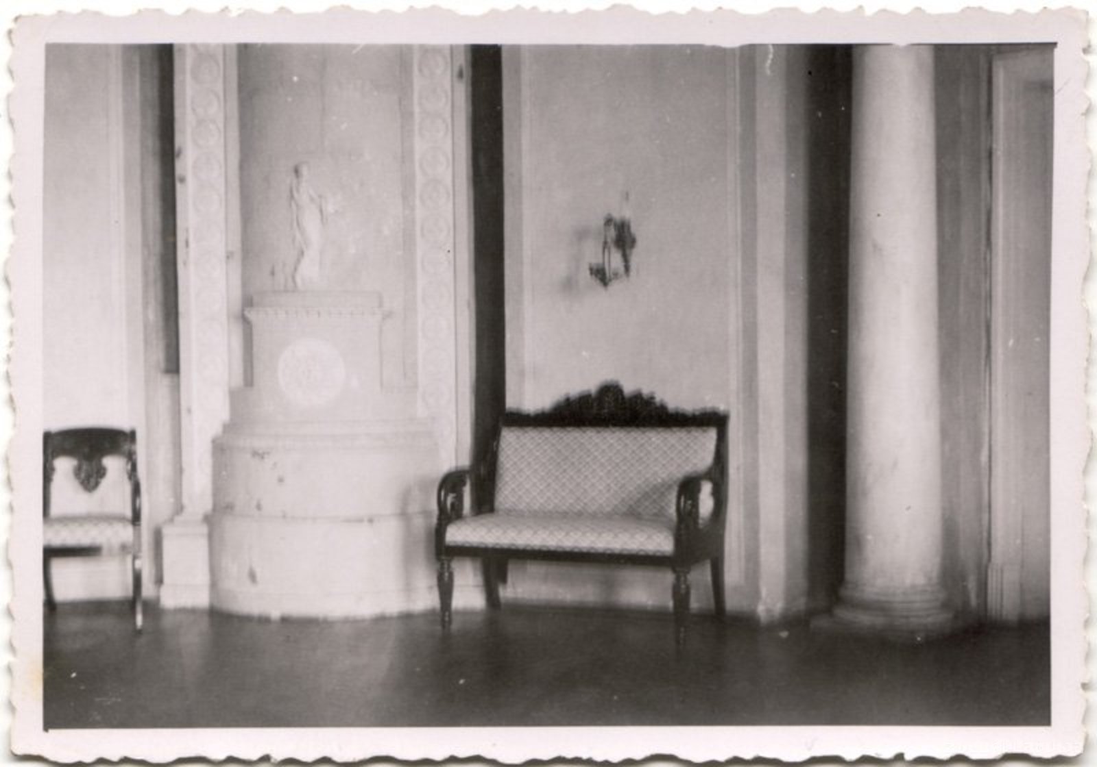 Dinsdurbes muižas kungu mājas zāle 20. gadsimta 30. gados. Dinsdurbes muižas kungu māja celta 19. gs. 30. gados klasicisma stilā pēc netālu esošās Elejas pils parauga. Sakarā ar agrāro reformu muižas ēkas un teritorija nonāca valsts īpašumā, bet tā kā šeit netika ierīkota ne skola, ne kāda cita saimnieciska iestāde, muižas ēkas ilgi palika novārtā. Līdz 1934. gadam muižas kungu mājā tika veikti vien zināmi uzturēšanas darbi. Attēls uzņemts pēc tam, kad 1934. gadā tā kļuva par pēdējā nomnieka Ģedimina Sandera īpašumu - tad tika atjaunotas gan ēkas fasādes, gan iekštelpas ar bīdermeiera stila mēbelēm un sakopts parks. Dinsdurbes muiža līdz mūsdienām nav saglabājusies - tā daļēji tika nopostīta II pasaules kara laikā, taču, tā kā pēc tam vairs nav mēģināts to atjaunot, tā ir zudusi pilnībā