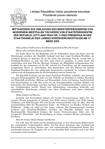 MITTAGESSEN AUF EINLADUNG DES MINISTERPRÄSIDENTEN VON NORDRHEIN-WESTFALEN TISCHREDE VON STAATSPRÄSIDENTIN DER REPUBLIK LETTLAND FRAU DR. V.VĪĶE-FREIBERGA IN DER STAATSKANZLEI DES LANDES NORDRHEIN-WESTFALEN AM 17. MÄRZ 2005