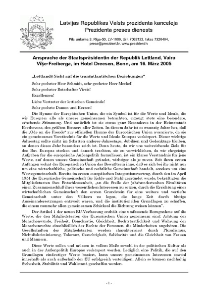 Ansprache der Staatspräsidentin der Republik Lettland, Vaira Vīķe-Freiberga, im Hotel Dreesen, Bonn, am 16. März 2005
