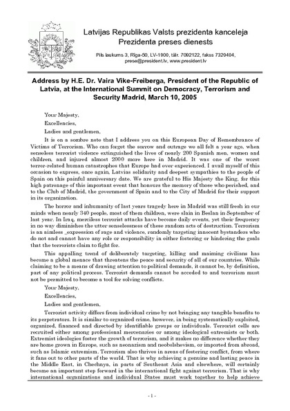 Address by H.E. Dr. Vaira Vike-Freiberga, President of the Republic of Latvia, at the International Summit on Democracy, Terrorism and Security Madrid, March 10, 2005