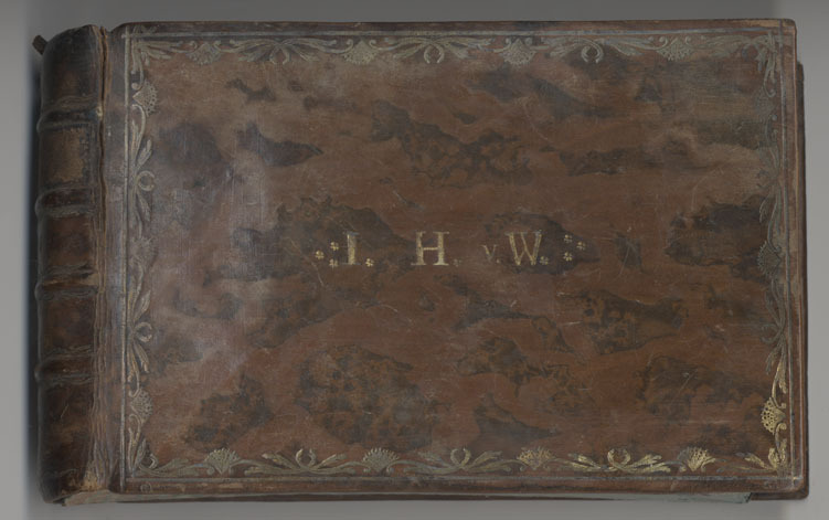 Attēlā albuma vāks ar īpašnieka iniciāļiem zeltītā spiedumā un ornamentālu apmali. Albums ievietots ādas futrālī ar zeltītu ornamentētu apmali un īpašnieka superekslibri centrā.