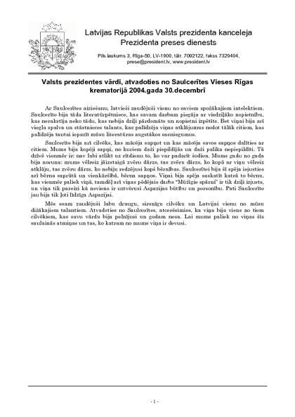 Valsts prezidentes vārdi, atvadoties no Saulcerītes Vieses Rīgas krematorijā 2004.gada 30.decembrī