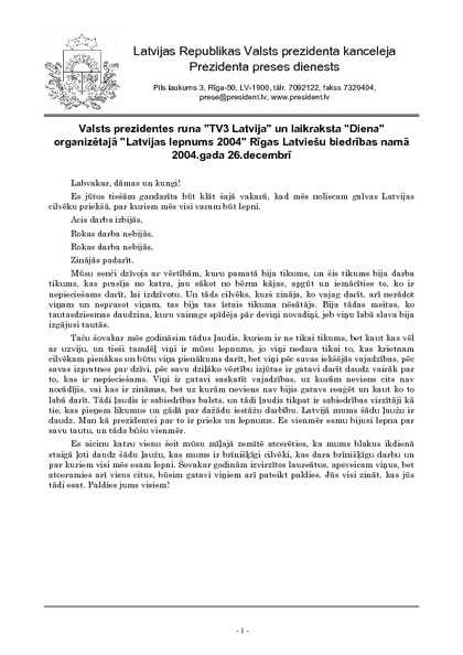 Valsts prezidentes runa "TV3 Latvija" un laikraksta "Diena" organizētajā "Latvijas lepnums 2004" Rīgas Latviešu biedrības namā 2004.gada 26.decembrī