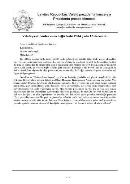 Valsts prezidentes runa Leļļu teātrī 2004.gada 17.decembrī