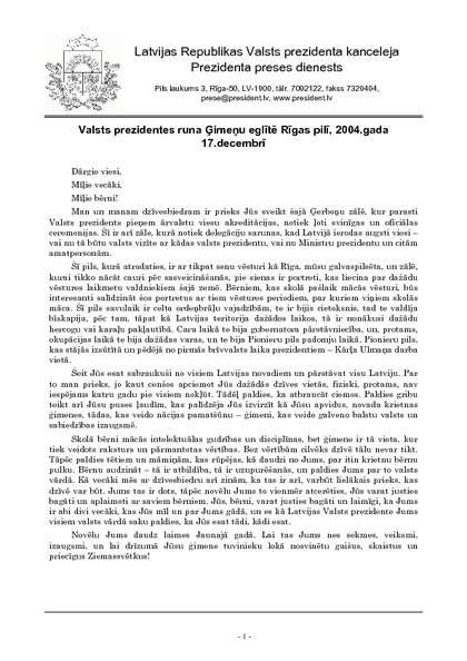 Valsts prezidentes runa Ģimeņu eglītē Rīgas pilī, 2004.gada 17.decembrī