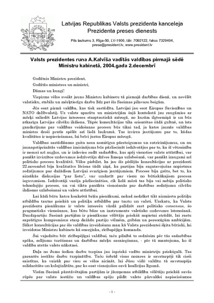 Valsts prezidentes runa A.Kalvīša vadītās valdības pirmajā sēdē Ministru kabinetā, 2004.gada 2.decembrī
