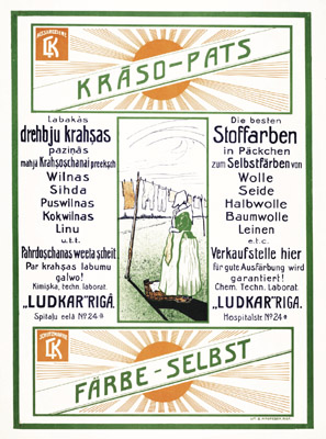 Krāso pats. Labakās drehbju krahşas paziņâs mahjâ krahşoşchanai preekşch wilnas, sihda, puswilnas, kokwilnas, linu u.t.t. Pahrdoşchanas weeta şcheit. Par krahşas labumu galwo! Kimişka, techn. laborat. "Ludkar" Rigā [attēls] = Färbe Selbst die besten Stoffarben in Päckchen zum Selbstfärben von Wolle, Seide, Halbwolle, Baumwolle, Leinen e.t.c. Verkaufstelle hier für gute Ausfärbung wird garantiert Chem. Techn. Laborat. "Ludkar" Riga