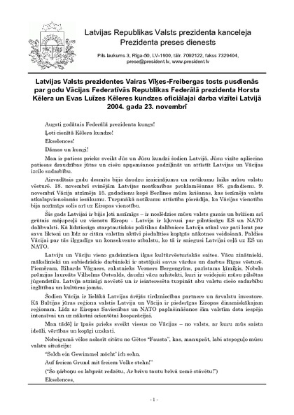 Latvijas Valsts prezidentes Vairas Vīķes-Freibergas tosts pusdienās par godu Vācijas Federatīvās Republikas Federālā prezidenta Horsta Kēlera un Evas Luīzes Kēleres kundzes oficiālajai darba vizītei Latvijā 2004. gada 23. novembrī