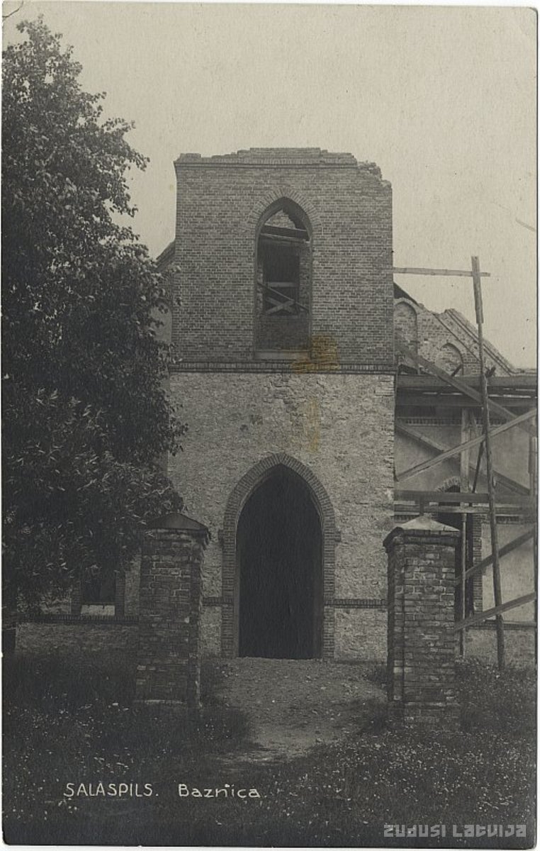 Pirmās ziņas pat Salaspils evaņģēliski luterisko Svētā Jura baznīcu ir atrodamas ap 1380. gadu, kad Livonijas ordenis Daugavas labajā krastā netālu no jaunās pils uzcēla Svētā Jura baznīcu. Laika gaitā tā ir pārbūvēta un karos postīta vairakkārt. 17. gadsimtā tā tika divreiz nopostīta un atjaunota (1638. un 1674. gadā), 1896. gadā tā tika paplašināta un tika piebūvēts zvanu tornis. Baznīca cieta arī Pirmajā pasaules karā, pēc tam 15 gadu laikā tā atkal tika atjaunota (attēlā redzams brīdis pirms tās atjaunošanas darbu pabeigšanas). Baznīca pēdējo reizi tika izpostīta Otrajā pasaules karā, pēc tam tā netika atjaunota, bet tās drupas 20. gadsimta 70. gados tika uzspridzinātas, kad tika būvēts Rīgas HES. Mūsdienās baznīcas drupas atrodas Rīgas HES ūdenskrātuves malā, virs altārdaļas mūra uzstādīts krusts