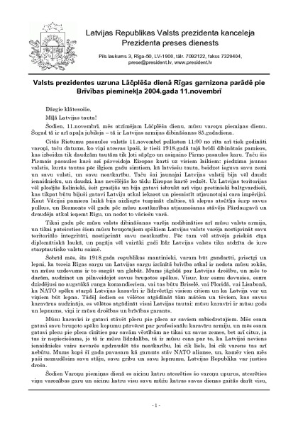 Valsts prezidentes uzruna Lāčplēša dienā Rīgas garnizona parādē pie Brīvības pieminekļa 2004.gada 11.novembrī