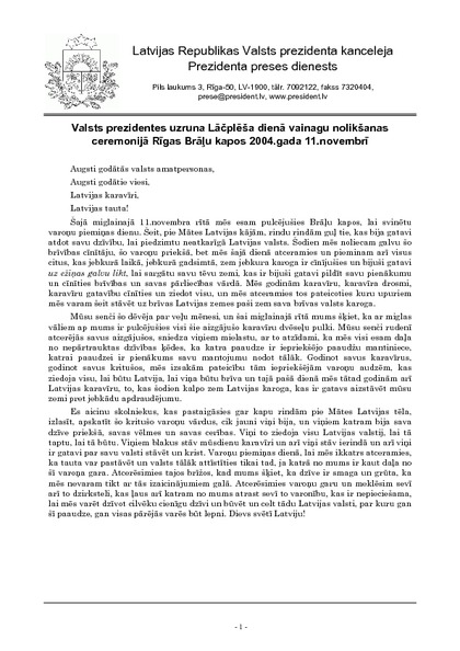 Valsts prezidentes uzruna Lāčplēša dienā vainagu nolikšanas ceremonijā Rīgas Brāļu kapos 2004.gada 11.novembrī