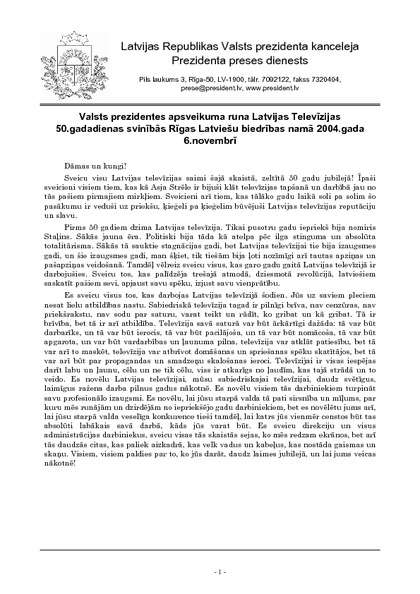 Valsts prezidentes apsveikuma runa Latvijas Televīzijas 50.gadadienas svinībās Rīgas Latviešu biedrības namā 2004.gada 6.novembrī