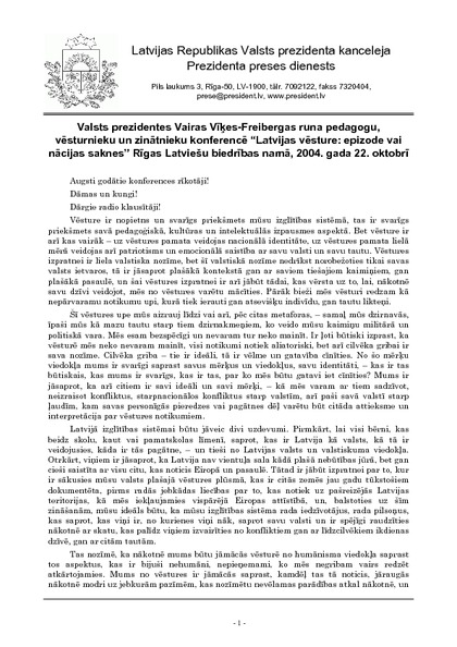 Valsts prezidentes Vairas Vīķes-Freibergas runa pedagogu, vēsturnieku un zinātnieku konferencē “Latvijas vēsture: epizode vai nācijas saknes” Rīgas Latviešu biedrības namā, 2004. gada 22. oktobrī