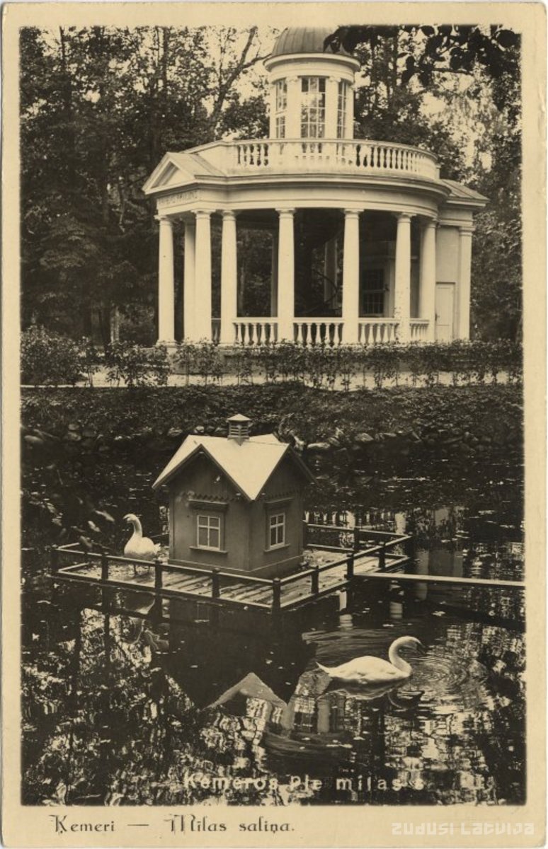 Viens no Ķemeru parka arhitektūras izteiksmīgākajiem objektiem. Uz mākslīgi izveidotās “Mīlestības saliņas” Vēršupītes kanāla noslēgumā jau kopš 19.gs. atradies kokgriezumiem bagātīgi rotāts paviljons. Tagadējā mūra rotondā kūrorta viesiem piedāvāti dzērieni ar uzkodām un atskaņota mūzika. Pie saliņas ir mūrēta terase uz laivu piestātni. Ar nelielām laiviņām bija iespējams braukāt pa Vēršupīti un kanālu sistēmu. Uz paviljona augšējo platformiņu ved kāpnes