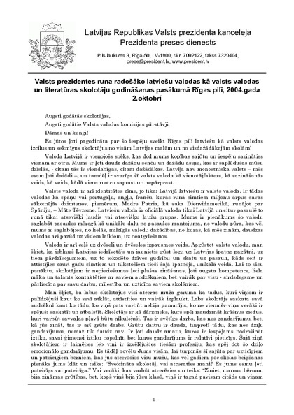 Valsts prezidentes runa radošāko latviešu valodas kā valsts valodas un literatūras skolotāju godināšanas pasākumā Rīgas pilī, 2004.gada 2.oktobrī