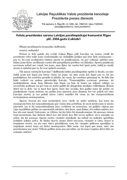 Valsts prezidentes uzruna Latvijas paralimpiskajai komandai Rīgas pilī, 2004.gada 2.oktobrī