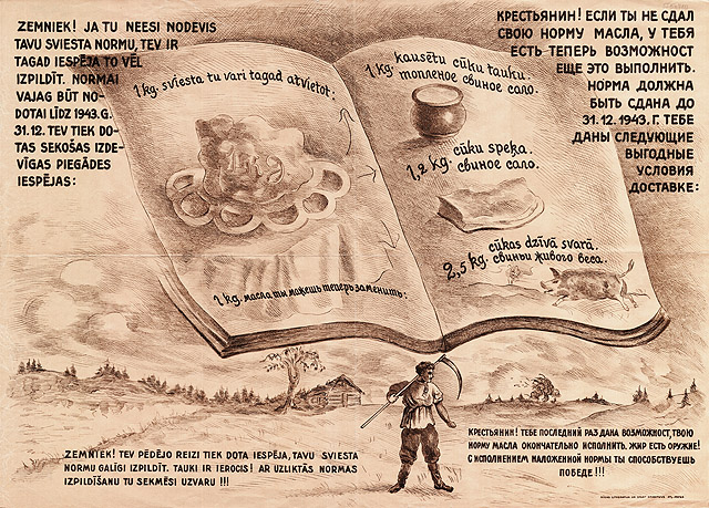 Zemniek! Ja tu neesi nodevis tavu sviesta normu, tev ir tagad iespēja to vēl izpildīt. Normai vajag būt nodotai līdz 1943.g.31.12. [attēls] = Крестьянин! Если ты не сдал свою норму масла, у тебя есть теперь возможост еще это выполнить. Норма должна быть сдана до 31.12.1943.г.