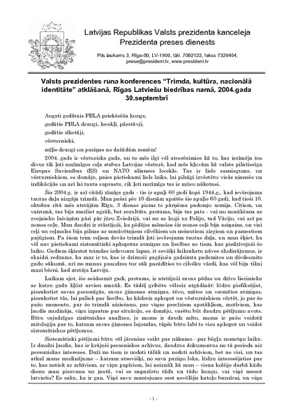 Valsts prezidentes runa konferences “Trimda, kultūra, nacionālā identitāte” atklāšanā, Rīgas Latviešu biedrības namā, 2004.gada 30.septembrī
