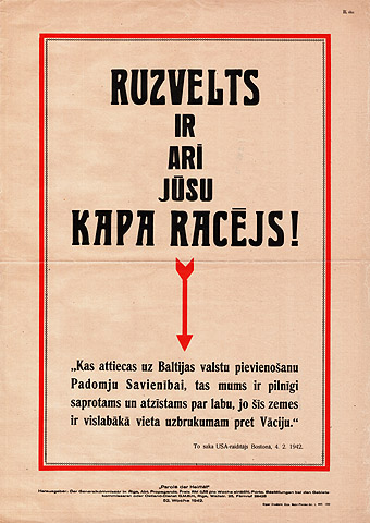 Ruzvelts ir arī jūsu kapa racējs! [attēls] "Kas attiecas uz Baltijas valstu pievienošanu Padomju Savienībai, tas mums ir pilnīgi saprotams un atzīstams par labu, jo šīs zemes ir vislabākā vieta uzbrukumam pret Vāciju." To saka USA-raidītājs Bostonā, 4.2.1942.