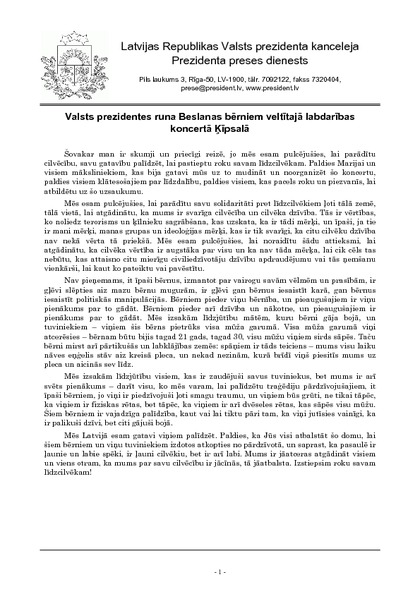 Valsts prezidentes runa Beslanas bērniem veltītajā labdarības koncertā Ķīpsalā