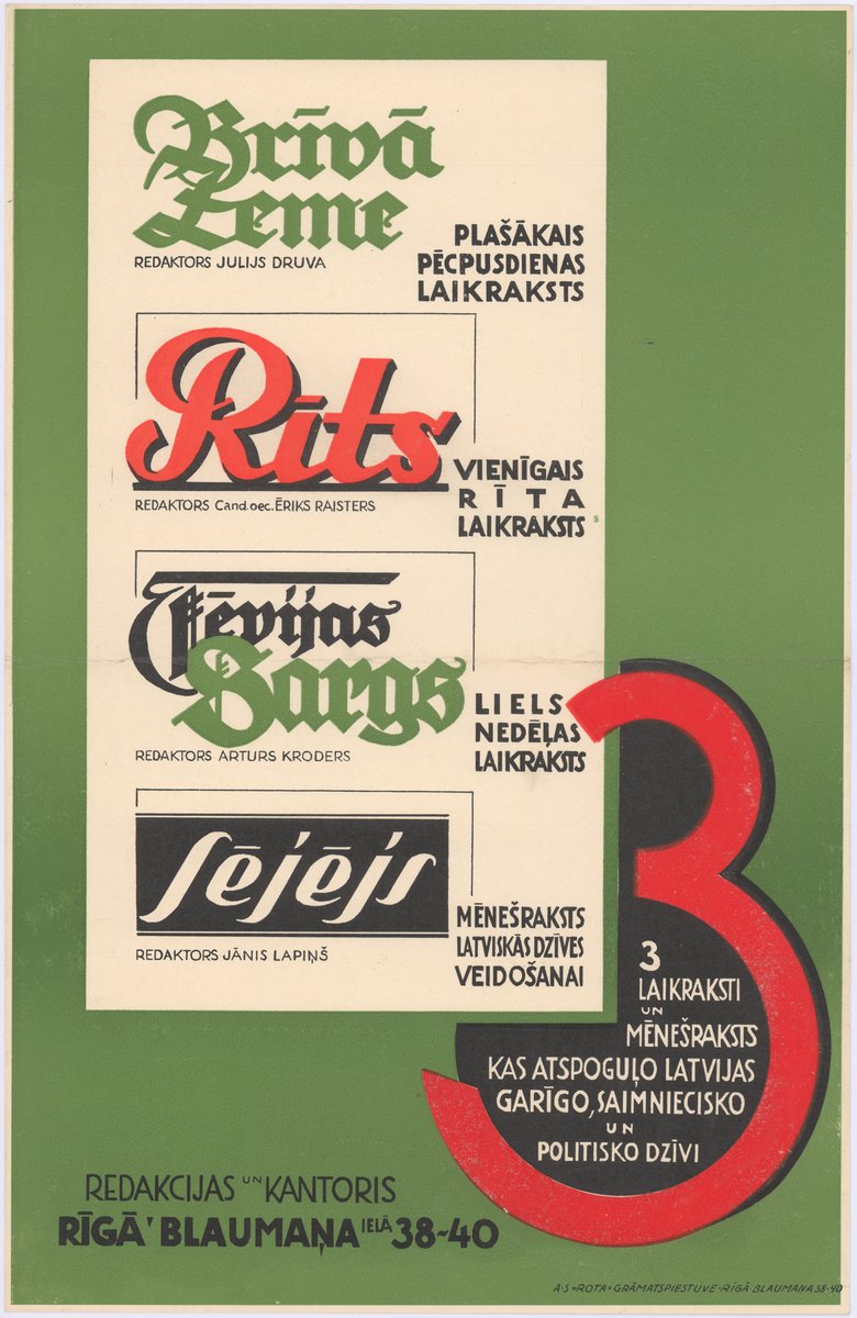Brīvā Zeme: plašākais pēcpusdienas laikraksts, Rīts: vienīgais rīta laikraksts, Tēvijas Sargs: lielais nedēļas laikraksts, Sējējs: mēnešraksts latviskās dzīves veidošanai - 3 laikraksti un mēnešraksts, kas atspoguļo Latvijas garīgo, saimniecisko un politisko dzīvi [attēls]