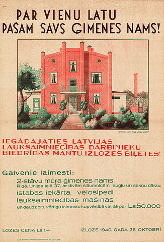Par vienu latu pašam savs ģimenes nams! Iegādājaties Latvijas lauksaimniecības darbinieku biedrības mantu izlozes biļetes! Izloze 1940.gada 26.oktobrī [attēls]