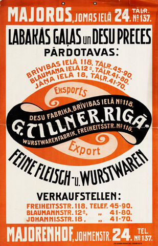 G. Tillner, Rīgā: desu fabrika, Brīvības ielā № 118. Labākās gaļas un desu preces pārdotavas [attēls] G. Tillner: Wurstwarenfabrik, Freiheitsstr. № 118. Feine fleisch -u. Wurstwaren Verkaufstellen
