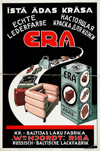 Īstā ādas krāsa ERA. Kr.[ievijas] - Baltijas laku farbrika "Wm Hjordt" Rīgā [attēls] = Echte Lederfarbe ERA. Russisch - Baltische lackfabrik "Wm Hjordt" = Настоящая краска для кожи ERA