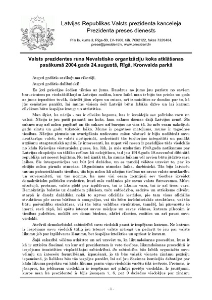 Valsts prezidentes runa Nevalstisko organizāciju koka atklāšanas pasākumā 2004.gada 24.augustā, Rīgā, Kronvalda parkā