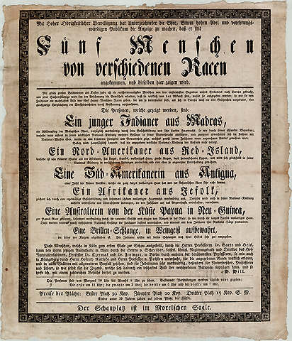 Plakāts savdabīgam iestudējumam, kurš adresēts plašai auditorijai - no skolēna līdz zinātniekam - kurā darbojas 5 personas un pārstāv 5 dažādas rases. Auditorija tiek iepazīstināta gan ar šo indivīdu ārējo izskatu, gan rakstura īpatnībām (darojas indiānis, ziemeļamerikānis, dienvidamerikānis, āfrikānis, austrāliete).