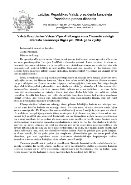 Valsts Prezidentes Vairas Vīķes-Freibergas runa Tiesnešu svinīgā zvēresta ceremonijā Rīgas pilī, 2004. gada 7.jūlijā