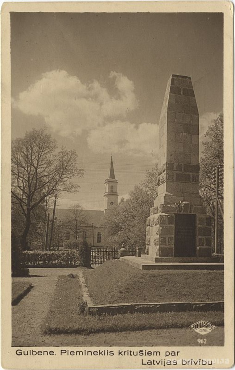 Pieminekļa pamatakmens likts 1928. gada 6. augustā. To cēla pēc E. Ābeliņa meta obeliska veidā. Veltīts 1905. gadā kritušajiem, Pirmā pasaules kara cīnītājiem, Stučkas valdības revolucionārā tribunāla upuriem un brīvības cīņu varoņiem no Gulbenes draudzes. Tās abās pusēs ir melnas granīta plāksnes ar tekstu. Priekšpuses augšdaļā veidota bronzas saulīte. Uz pieminekli ved kāpnes, kuru katrā malā uz granīta postamentiem novietotas stilizētas urnas. Atklāts 1929. gada 20. maijā. 1940. gadā, sākoties padomju okupācijai, no obeliska pazuda bronzas saulīte, bet pēc Otrā pasaules kara obelisks tika daļēji nojaukts un tā vietā uzstādīja ģipša padomju karavīru. 1960. gadā ģipša karavīru un pamatus nojauca.1989. gadā pēc iedzīvotāju ierosinājuma tika nolemts atjaunot šo pieminekli, kam tauta devusi Brīvības pieminekļa vārdu. To atjaunoja tēlnieks Ojārs Feldbergs un 1992. gada 10. novembrī piemineklis tika iesvētīts. Pretī piemineklim atrodas Gulbenes evaņģēliski luteriskā baznīca, kuru uzcēla Gulbenes bruņinieku pilsdrupu vietā. Baznīcas pamati likti 1838. gada 11. jūlijā. 1843. gada 11. jūlijā baznīca tika iesvētīta. Tā celta klasicisma stilā, ar zvanu torni, ko Otrā pasaules kara laikā 1944. gadā sagrāva. Līdz ar to gāja bojā arī baznīcas ērģeles. 1992. gadā uzsākti torņa atjaunošanas darbi, bet līdzekļu trūkuma dēļ pārtraukti. Grezna bijusi arī baznīcas iekšiene – abpus altārim bijuši divi vitrāžas logi un baznīcu apgaismojuši divi dārgi kroņlukturi. Līdz mūsdienām saglabājies vienīgi greznais baznīcas altāris, kas griezts no ozola koka gotikas stilā, kā arī kancele un pults