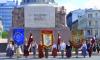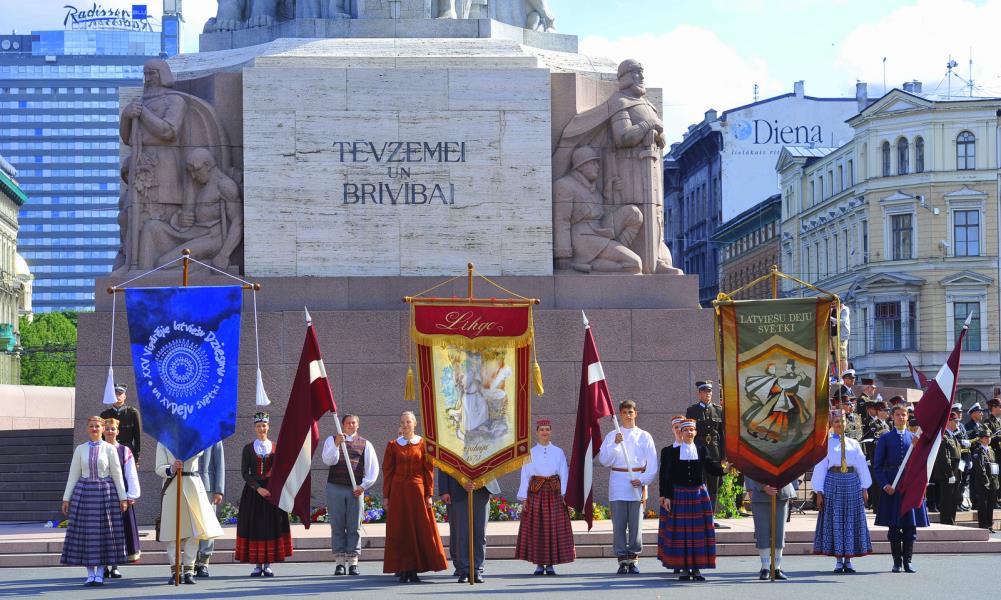 Tautas deju ansamblis "Līgo" pie Brīvības pieminekļa pirms gājiena