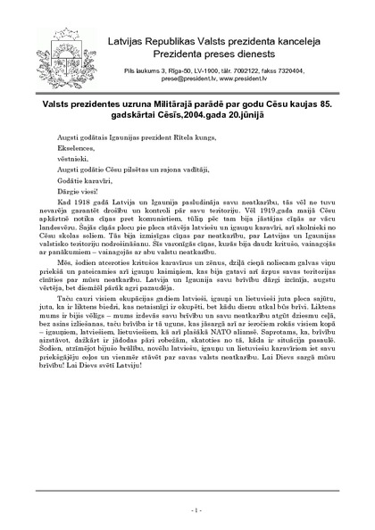 Valsts prezidentes uzruna Militārajā parādē par godu Cēsu kaujas 85. gadskārtai Cēsīs,2004.gada 20.jūnijā