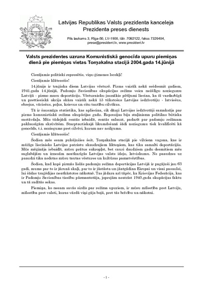 Valsts prezidentes uzruna Komunistiskā genocīda upuru piemiņas dienā pie piemiņas vietas Torņakalna stacijā 2004.gada 14.jūnijā