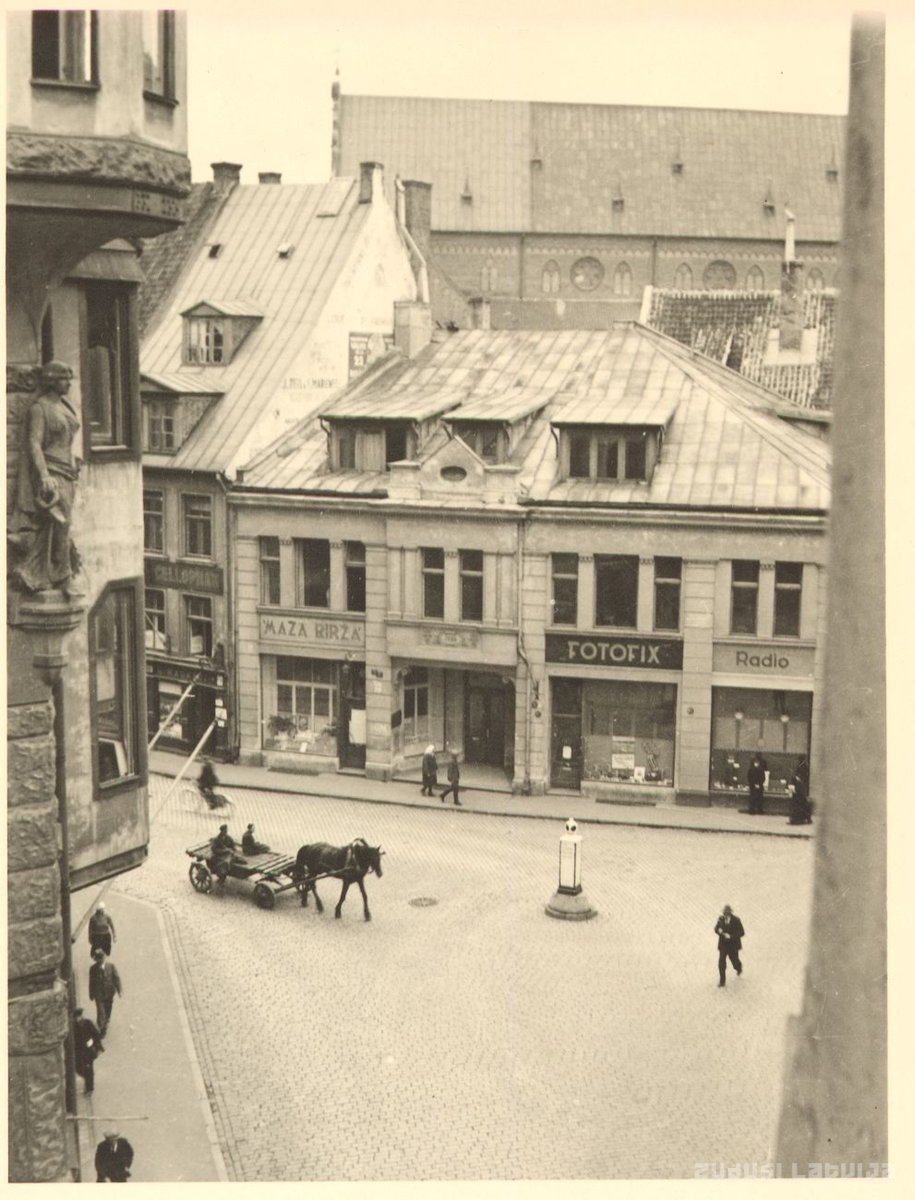 Doma laukuma apbūve pirms ēku nojaukšanas 1936. un 1937. gadā. Skats no Jēkaba ielas un Smilšu ielas stūra. Attēlā arī luksofors un zirgu pajūgs. Jēkaba iela. Smilšu iela