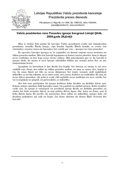 Valsts prezidentes runa Pasaules igauņu kongresā Lielajā Ģildē, 2004.gada 26.jūnijā