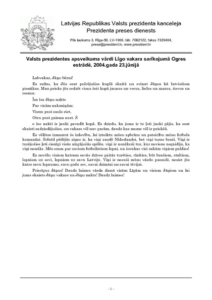 Valsts prezidentes apsveikuma vārdi Līgo vakara sarīkojumā Ogres estrādē, 2004.gada 23.jūnijā