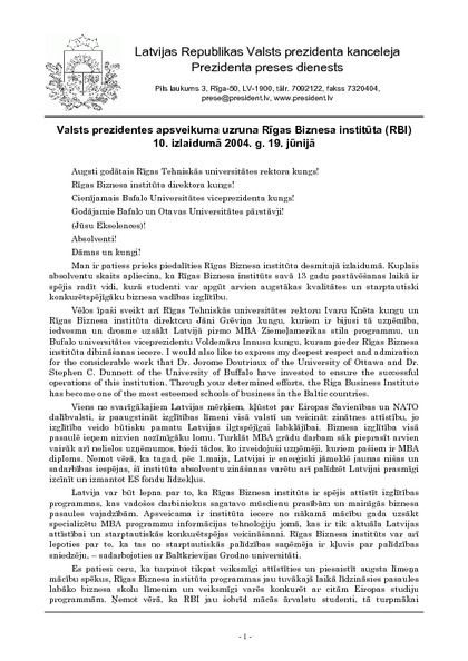 Valsts prezidentes apsveikuma uzruna Rīgas Biznesa institūta (RBI) 10. izlaidumā 2004. g. 19. jūnijā