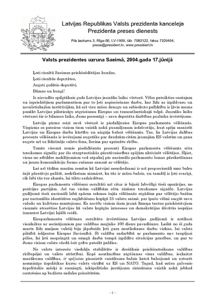 Valsts prezidentes uzruna Saeimā, 2004.gada 17.jūnijā