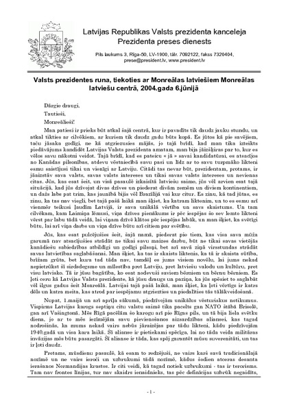 Valsts prezidentes runa, tiekoties ar Monreālas latviešiem Monreālas latviešu centrā, 2004.gada 6.jūnijā