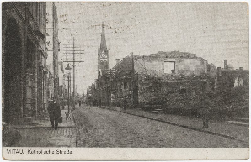 Katoļu iela laika gaitā savu nosaukumu ir mainījusi varākkārt. Sākotnēji to sauca par Königstrasse jeb Kataļa ielu, tad par Katolische Strasse un latviskojot par Katoļu ielu. Attēls ir uzņemts I pasaules kara laikā. Attēla centrā atrodas Bezvainīgās Marijas ieņemšanas katoļu baznīcas tornis. Baznīca ir celta no 1902. līdz 1906.gadā, par godu Jaunavas Marijas bezvainīgajai ieņemšanai. Baznīca ir celta Ziemeļu neogotikas stilā no sarkaniem ķieģeļiem, ar vienu torni, transeptu un trīs jomiem. Pēc II pasaules kara no baznīcas pāri palikušas bija tikai sienas, mūsdienās baznīca ir rekonstruēta. Kopš 1996.gada baznīcai ir piešķirts katedrāles nosaukums.