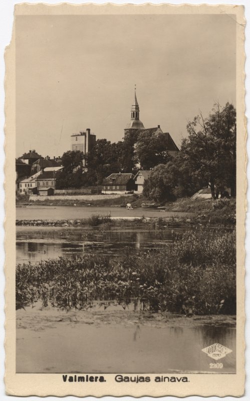 Skats pāri Gaujai uz pilsētu. Atklātnes centrā Sv. Sīmaņa baznīca, kas ir viena no senākajām Latvijas mūra celtnēm. Tās būvniecība iesākta 1283.gadā Livonijas ordeņa mestra Vilekina fon Endorfa laikā. Baznīcas iesvētīšana notikusi Sīmaņa un Jūdas (Simjūda) dienā un tāpēc tā nosaukta Sv. Sīmaņa vārdā. Karu laikā baznīca daudz cietusi, it īpaši Ziemeļu karā, kad 1702.gadā ugunsgrēkā banīca tika pamatīgi nopostīta. 1778.gadā notikusi torņa pārbūve, 1851. gadā uzbūvēta jauna sanskristeja, remonta darbi veikti arī 1908.gadā. Baznīca nedaudz postīta arī kara laikā 1919. un 1944.gadā. Padomju okupācijas laikā 1964.gadā Sv. Sīmaņa baznīca draudzei tika atsavināta. Tajā atradās Valmieras novadpētniecības muzeja filiāle. Sv. Sīmaņa draudze baznīcu pārņēma 1990.gadā, bet juridiski ēku atguva 1996.gadā. Pa kreisi no baznīcas redzama augsta, četrkantaina celtne, t.s. ūdenstornis.