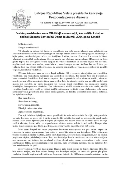 Valsts prezidentes runa Oficiālajā ceremonijā, kas veltīta Latvijas dalībai Eiropas Savienībā Doma laukumā, 2004.gada 1.maijā