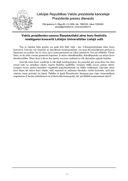 Valsts prezidentes uzruna Starptautiskā zēnu koru festivāla noslēguma koncertā Latvijas Universitātes Lielajā aulā