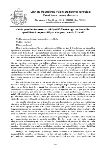Valsts prezidentes uzruna, atklājot IV Ginekologu un dzemdību speciālistu kongresu Rīgas Kongresu namā, 22.aprīlī